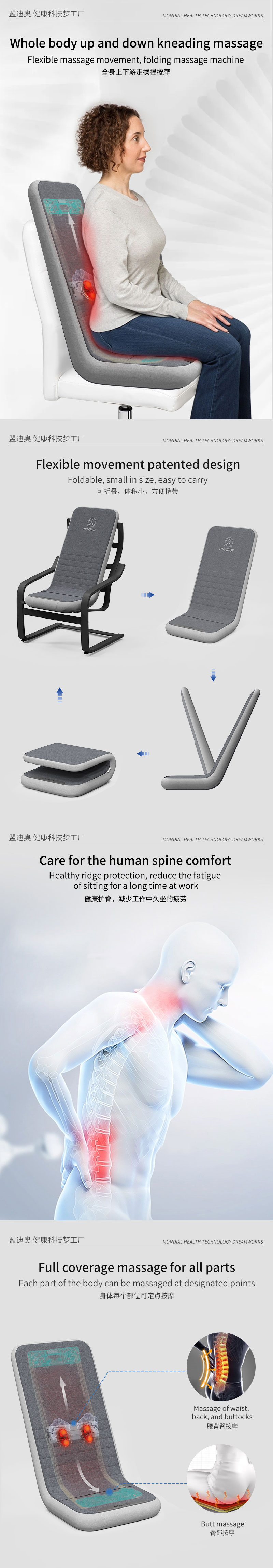 1、L型機(jī)芯結(jié)構(gòu),對折包裝縮小體積2、獨家專利柔性機(jī)芯3、力度三檔調(diào)節(jié),定點按摩,腰背按摩、臀腿按摩、全背按摩模式選擇4、背部行走揉捏,按摩區(qū)域加長到從肩膀到大腿;5、更加貼合不同款式的椅子整體可對折收納6、亞馬遜標(biāo)準(zhǔn)包裝尺寸